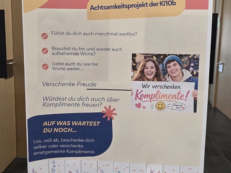 Unter dem Stichwort Achtsamkeit hat die Ki10b diese Woche Komplimente to go im Schulhaus verteilt.